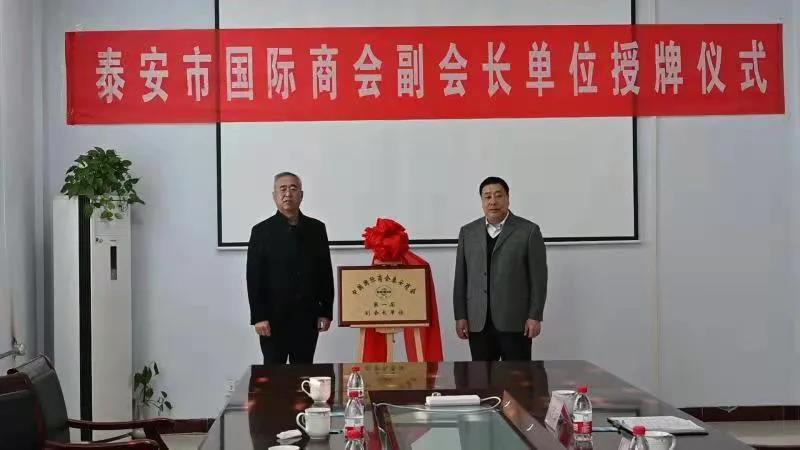 11月24日上午,泰安市貿促會黨組書記、會長陳勇、副會長張桂明一行,在肥城市貿促會會長朱建國、副會長王萬里和高新區黨工委副書記、王瓜店街道黨工委書記杜輝等陪同下來金塔集團舉辦泰安市國際商會副會長單位授牌儀式。